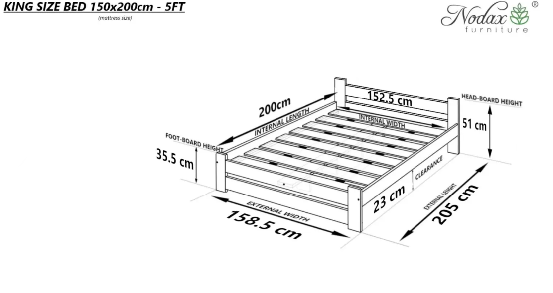King (for 150 × 200cm mattress) – W 159cm × L 205cm, with 23cm underbed clearance