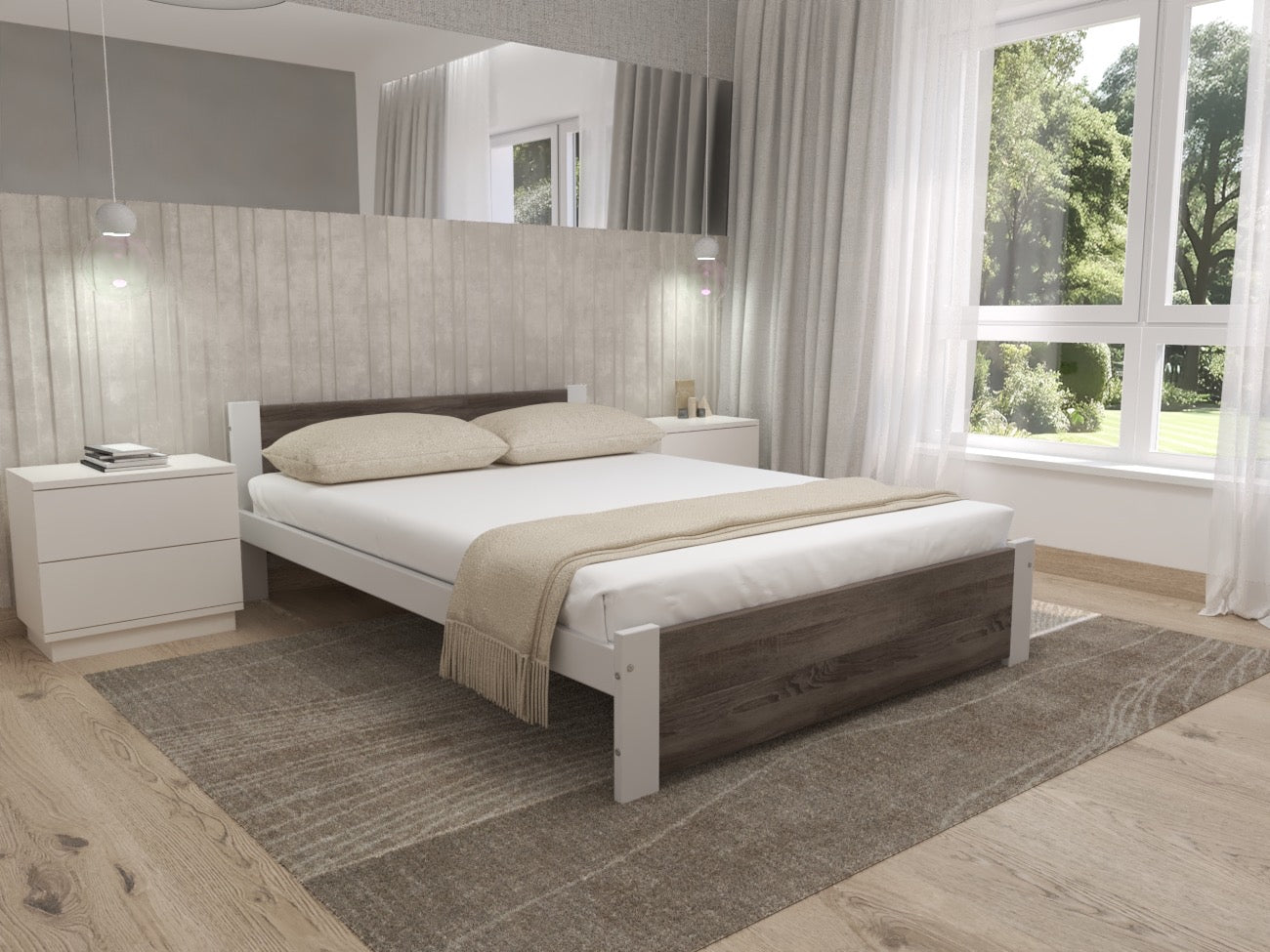 The side panels, legs, and slats are made from solid pine wood, painted in white for a bright, timeless feel, while the headboard and footboard feature high-quality furniture board finished in your chosen laminate colour — White, Graphite, or Sonoma Oak. This combination delivers the look of a coordinated modern bed, with the strength and stability you expect for everyday use.